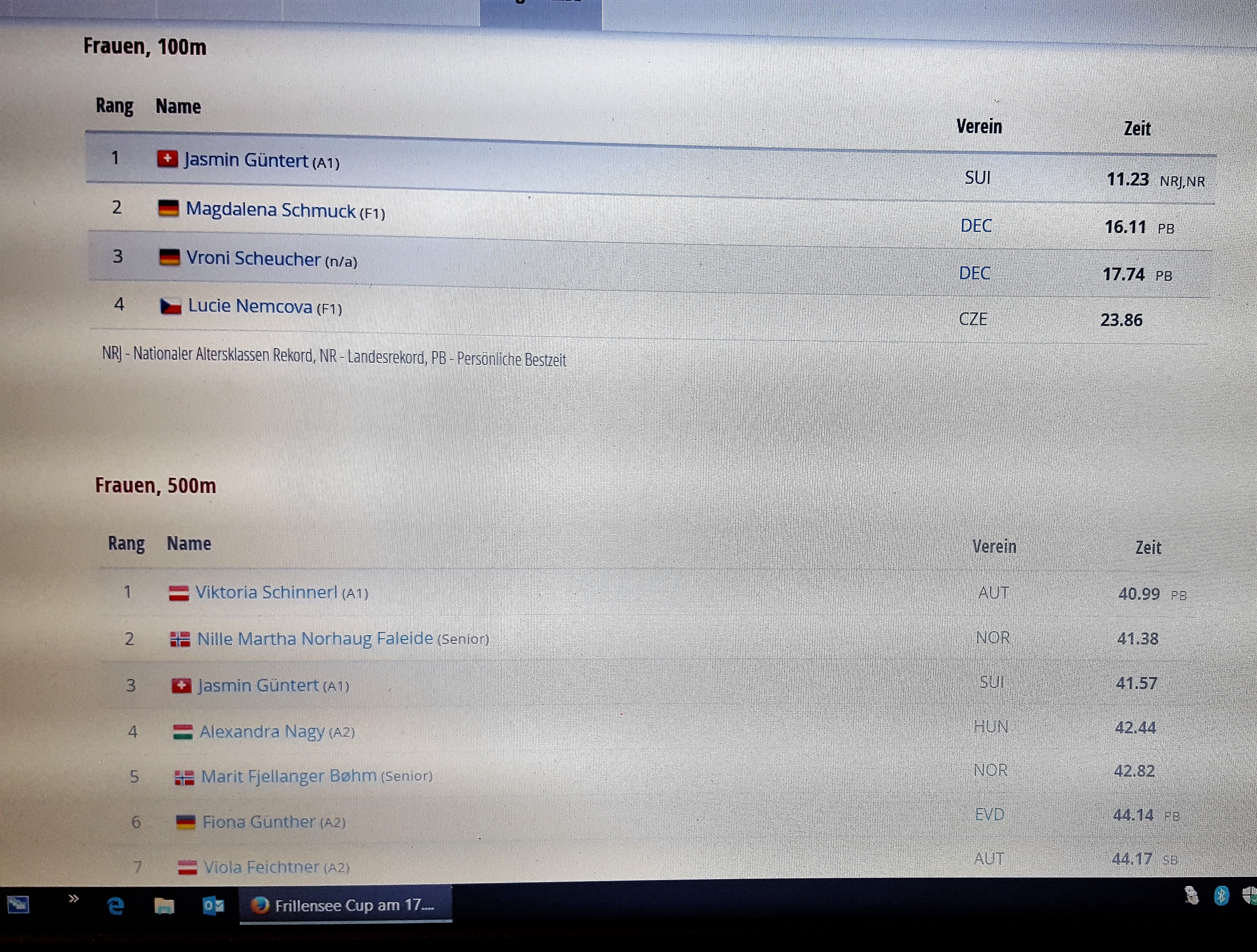 Nach zwei Wochen Training in Inzell startete ich beim Internationalen Rennen über die kurzen Distanzen, um ein letztes Mal meine Form zu überprüfen. Über die Distanz von 100 Meter konnte ich mit einer Zeit von 11.23 Sekunden meine Schnelligkeit unter Beweis stellen und damit sogar den Schweizerrekord um 0.04 sec. verbessern (vorher Kaitlyn Mc Gregor, 11.27 sec.). Und nur gerade eine halbe Stunde später lief ich mit einer Zeit von 41.57 Sekunden über 500 Meter nur gerade 0.03 sec. langsamer als meine persönliche Bestzeit.